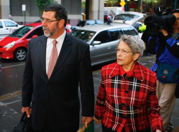 Caren Jenning with her lawyer, during her Supreme Court trial in Sydney, June 2008